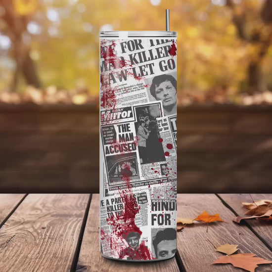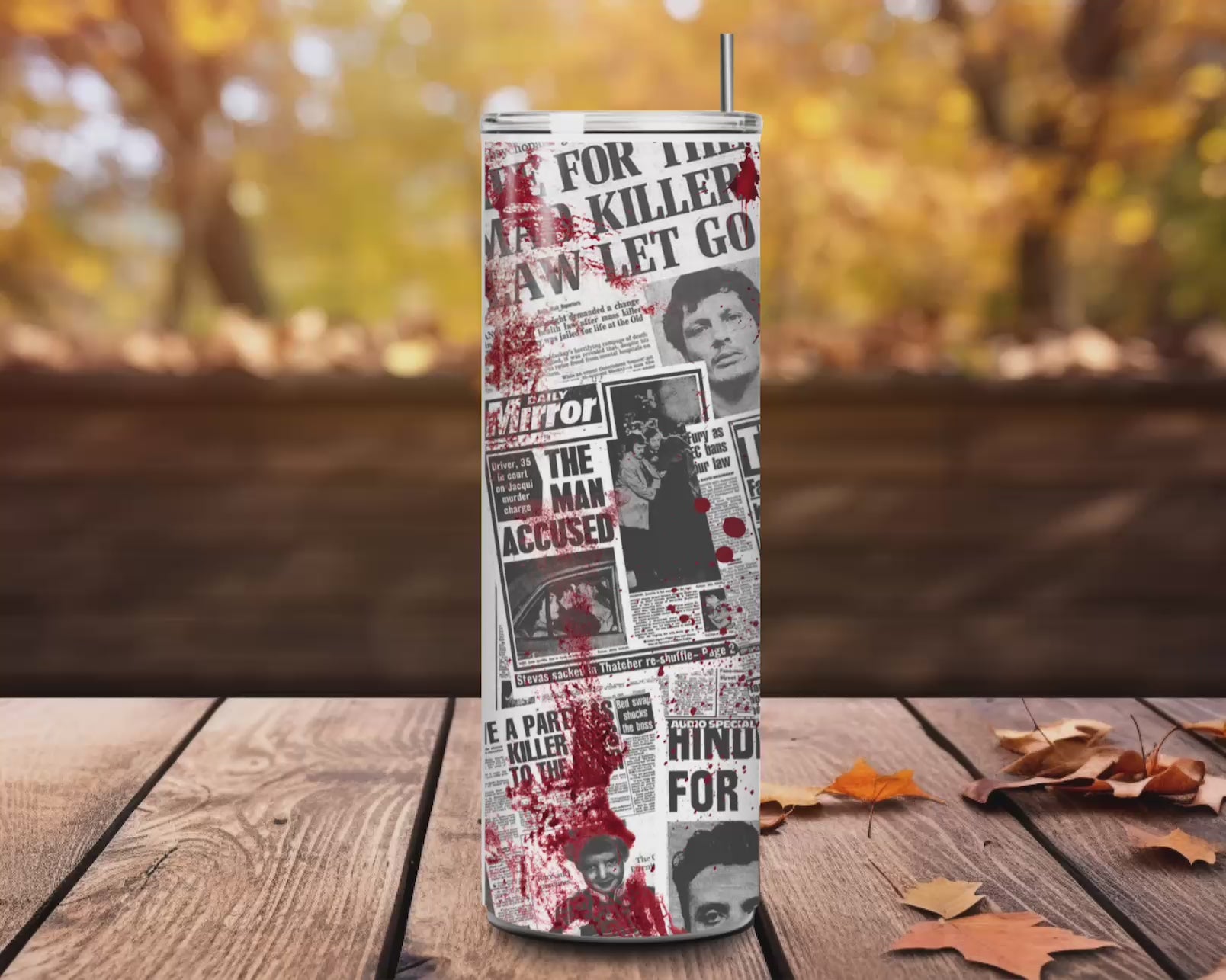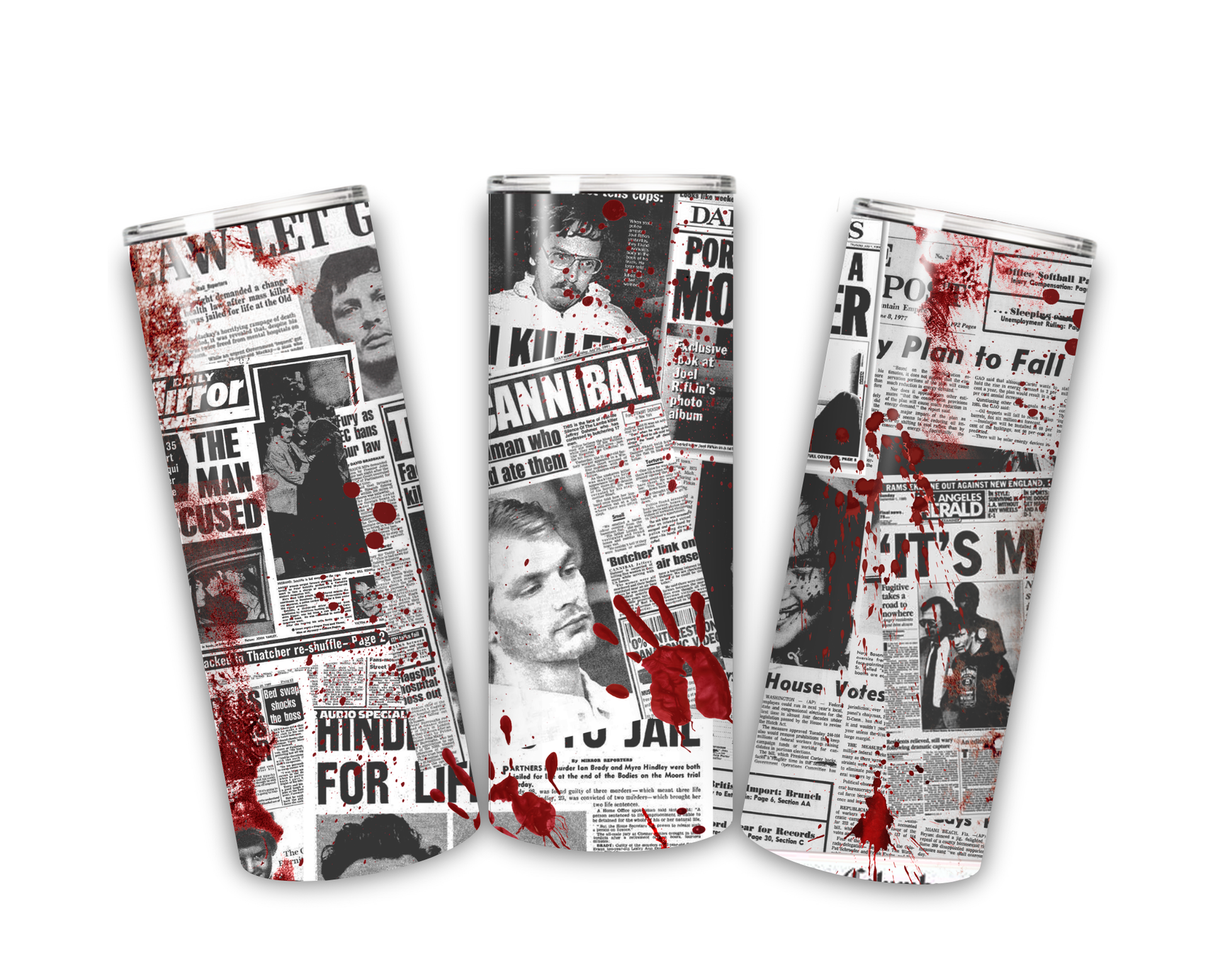 This 20 oz stainless steel tumbler is drenched in infamy. Splattered with blood and wrapped in real-life headlines from history's most sadistic killers. It's not just a drinkware item - it's a statement piece for the morbidly curious.